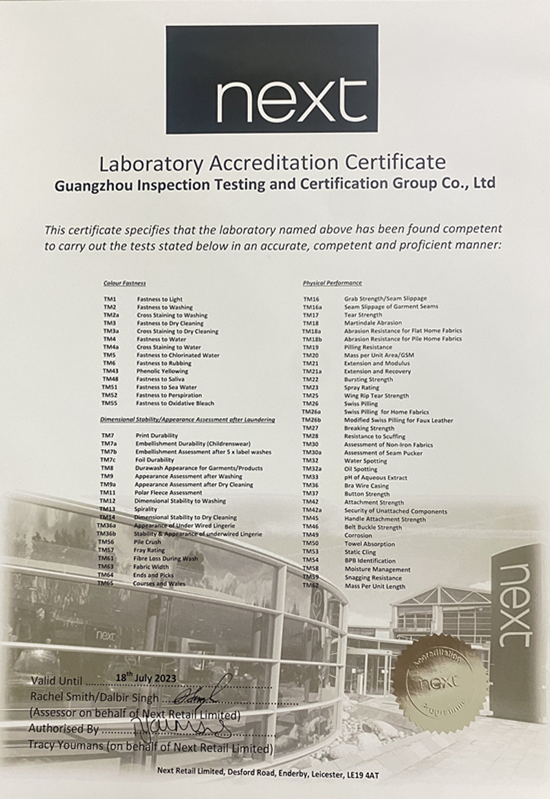 2022年7月18日, 广检集团正式成为英国NEXT零售有限公司认可检测实验室,可承接NEXT品牌下服装、服饰、家纺等产品的检测项目。