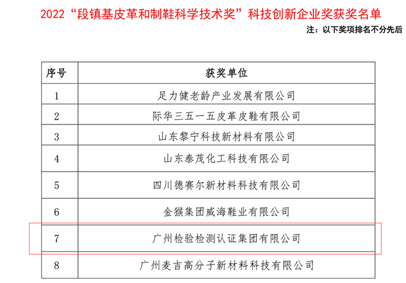 近日,段镇基皮革和制鞋科学技术奖励办公室对2022年“段镇基皮革和制鞋科学技术奖”评审结果进行了通报,广检集团主持承担的《皮革和毛皮材质自动鉴别技术及鉴别人员能力评价方法研究》荣获科技创新项目二等奖、《基于绿色化学法测试皮革制品偶氮染料关键技术研究开发及应用》荣获科技创新项目三等奖,同时,集团公司荣获科技创新企业奖。