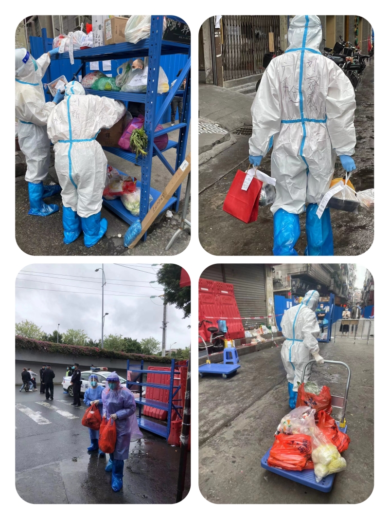 近日广州阴雨连绵,志愿者们冒着雨仍在坚持为居民们及时派送物资,广纺第二党支部的刘新衣服都湿透了,仍坚守岗位,尽快把物资送到每一户居民的手中,保障疫情防控工作有序正常的运行。