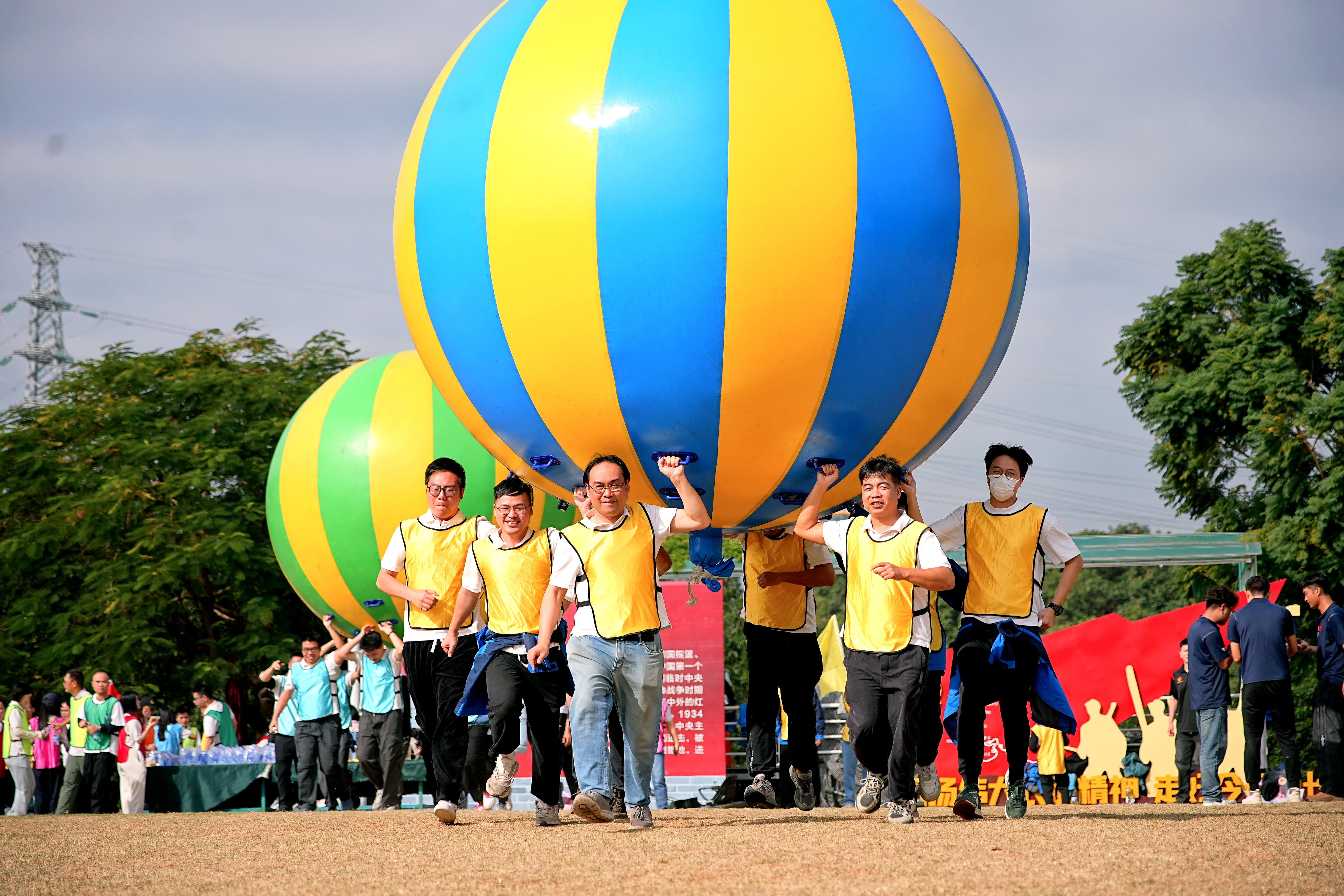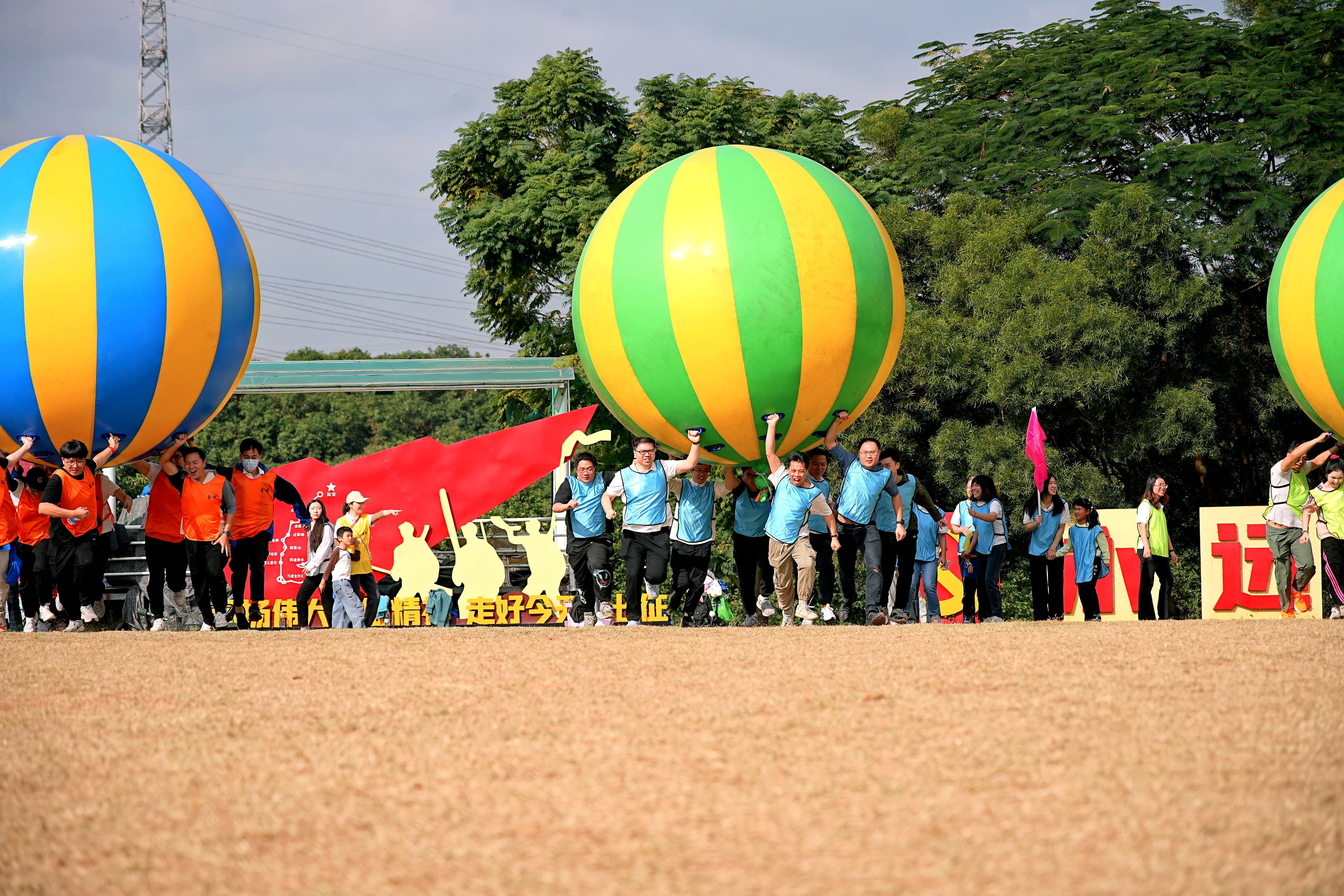 “鸿运当头”项目中,队员们齐心协力抬起充气巨球,步伐一致向终点冲刺,现场加油声、呐喊声不绝于耳。