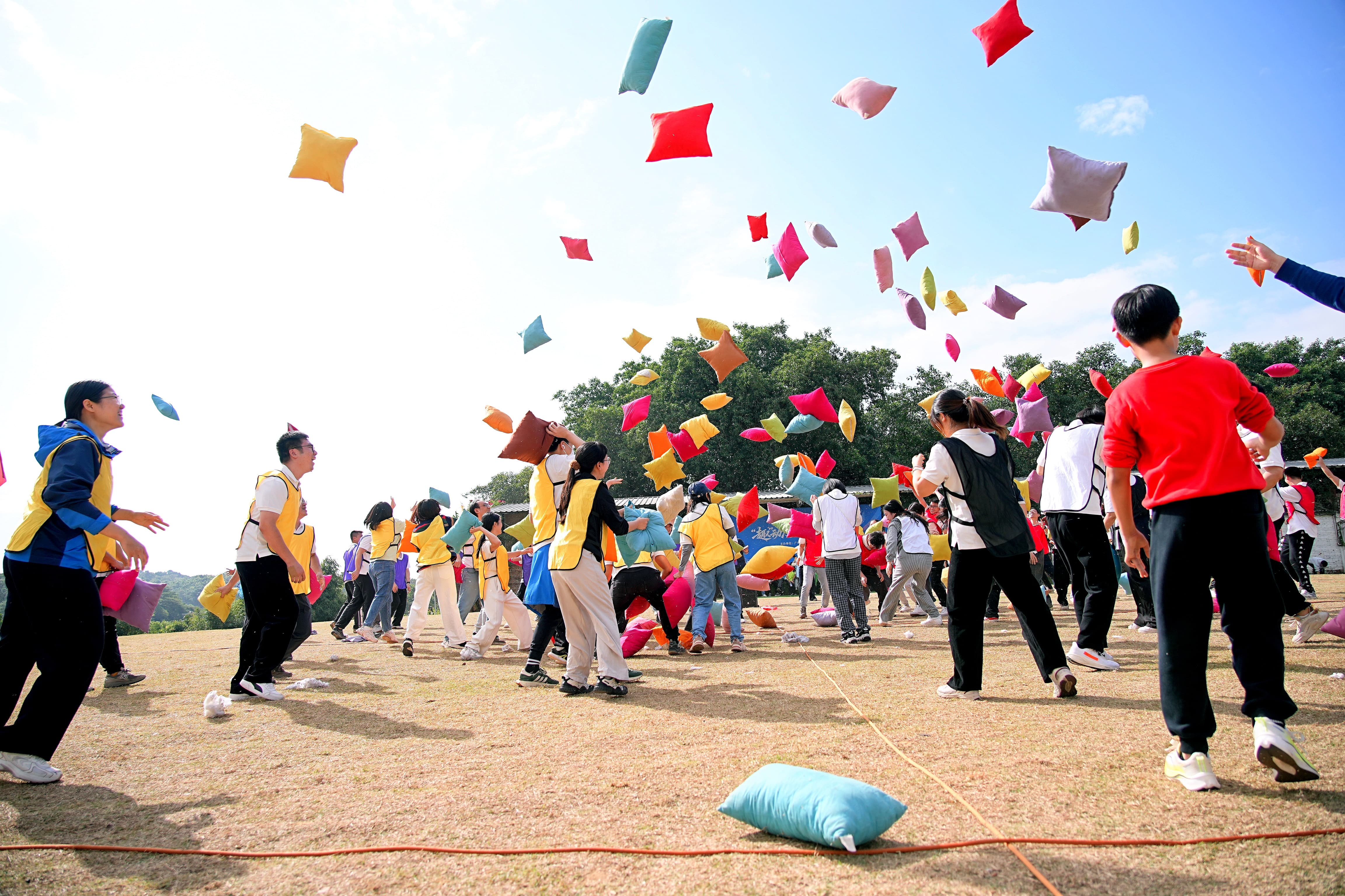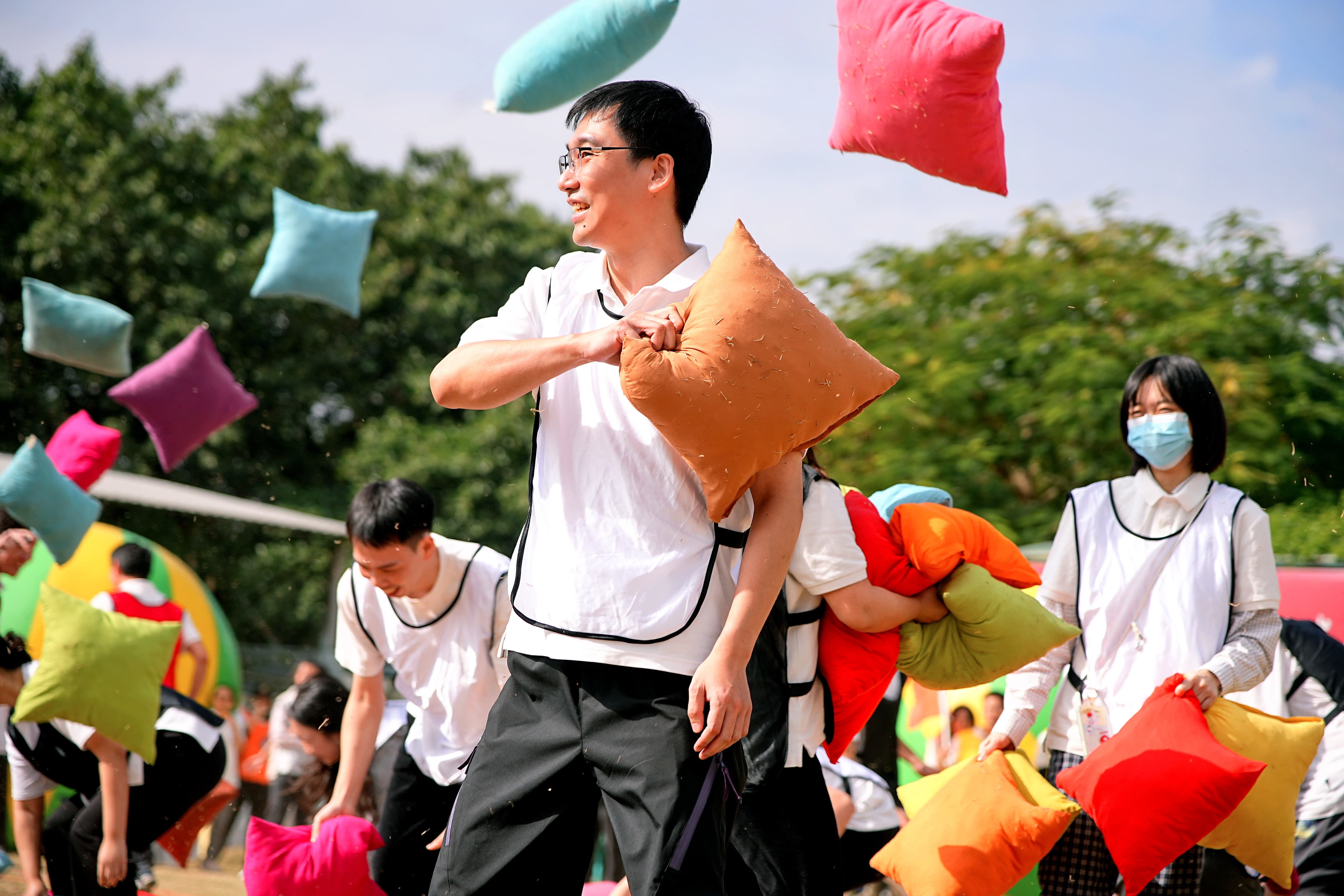 “枕头大战”环节,大家卸下工作压力,在柔软的“对战”中释放快乐,笑声传遍赛场每个角落。