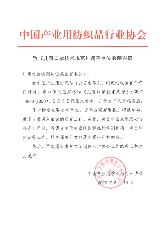 近日,广检集团主要起草的儿童口罩的国家标准《儿童口罩技术规范》,已于5月6日正式发布,获得牵头单位中国产业用纺织品行业协会的高度评价,特此发来感谢信。信中主要对广检集团在儿童口罩技术规范编制过程中的突出贡献给予充分肯定。