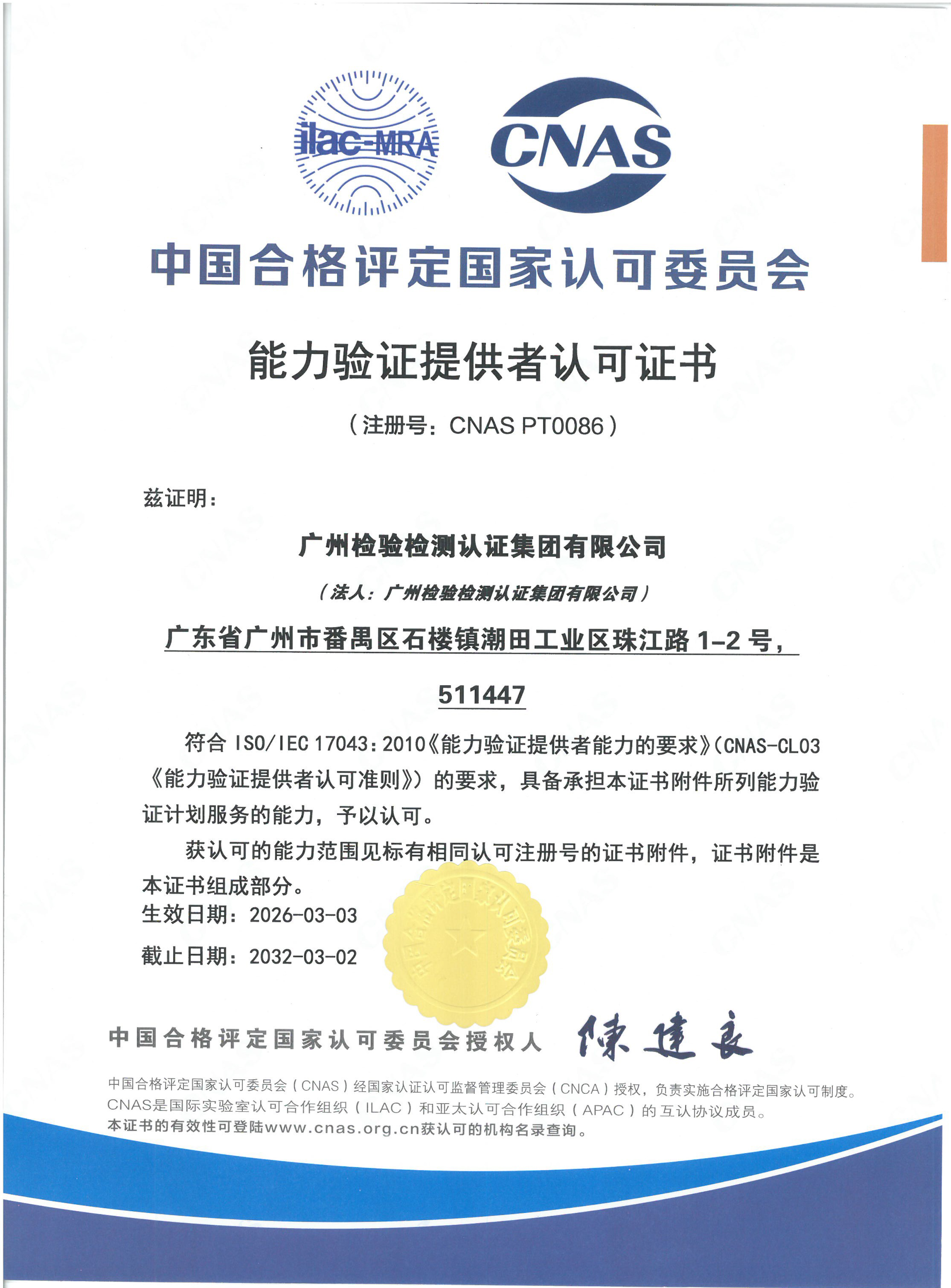 广建公司检验机构认可CNAS证书