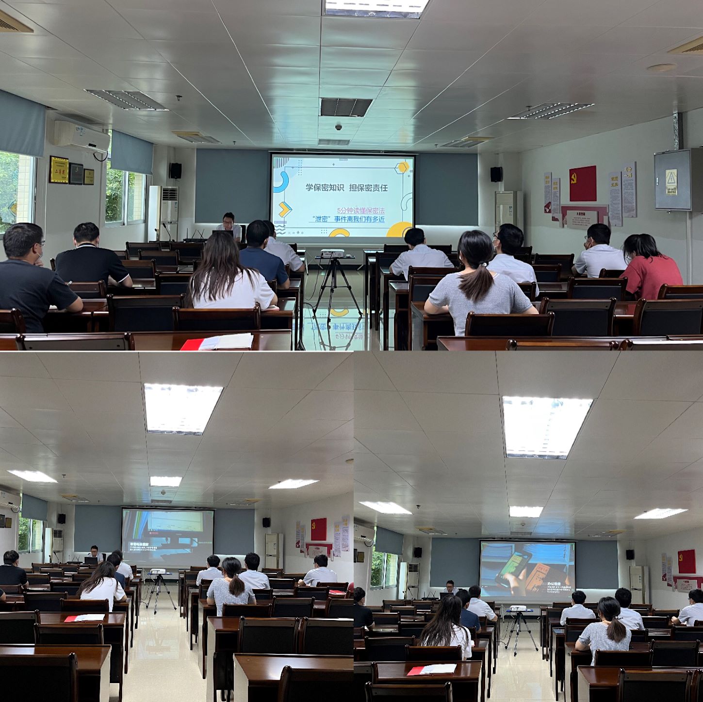 活动伊始,沈光来同志首先带领全体党员学习了保密知识,介绍了商业秘密、工作秘密以及日常保密的注意事项。随后一起观看了《5分钟读懂保密法》、《“泄密”事件离我们有多近》、《机关、单位微信工作群保密管理须知》、《微信泄密系列案例》等保密警示教育片。通过多种失泄密案例,深入剖析了泄密给工作单位乃至国家安全造成的严重危害,再一次敲响了保密安全警钟。曹太全同志认为,作为一名国企员工,保密工作与我们密切相关,我们必须不断提高保密意识,强化保密观念。梅运华同志认为,涉密人员要把保密管理当作保饭碗、保前途、保家庭幸福的事情来做,保障改革开放和社会主义事业顺利进行。