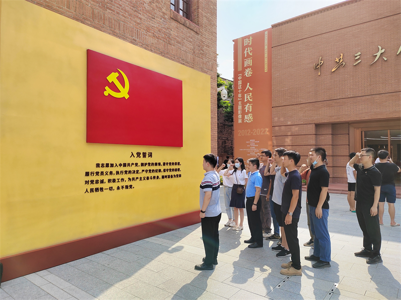 中共三大会址纪念馆馆内设置了“上下求索”“凝聚共识”“风起云涌”“理想之光”四个展出单元,馆内的陈列展览生动展现了中国共产党第三次全国代表大会的历史背景、召开过程、重大成果和深远影响。厅内的全息影像沉浸式场景《共识·1923》将现代科技与历史叙事相结合,生动形象地还原了会场情景,再现了代表们在大会上思想交锋、激烈讨论,就共产党人加入国民党问题最终达成共识的过程。参观结束后,广检工程检测中心第二党支部全体党员在馆外面向党旗重温入党誓词。