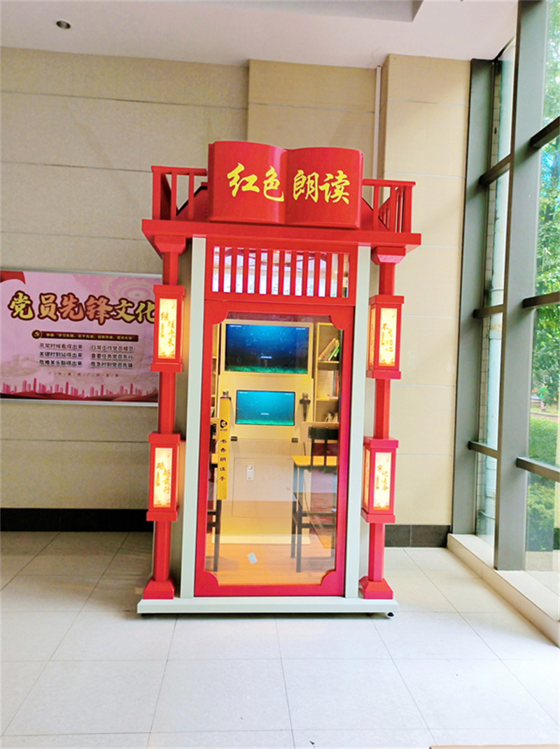在喜迎党的二十大召开之际,为扎实推进党建引领业务发展,加强企业文化建设,创新党员教育形式,丰富党员教育内容,凝聚广大党员干部奋进力量,2022年8月12日,广检集团广纺党委在番禺园区纤检楼大堂设立的“红色朗读亭”正式启用。